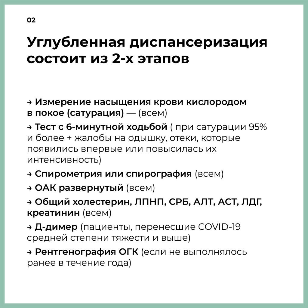 Первый этап включает такие исследования: общий и биохимический анализы крови, сатурация, тест с 6-минутной ходьбой, спирометрия, рентген грудной клетки, прием терапевта. Для переболевших COVID-19 – дополнительно анализ на определение концентрации D-димера в крови с целью выявить признаки тромбообразования.